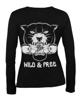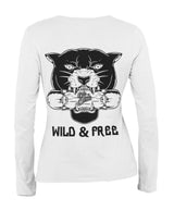 Small colour print on front with a big black and white print on back including writing 'Wild and Free'